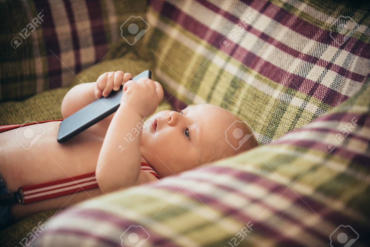 Infant Use Mobile Phone Or Smartphone Baby Boy With Suspenders