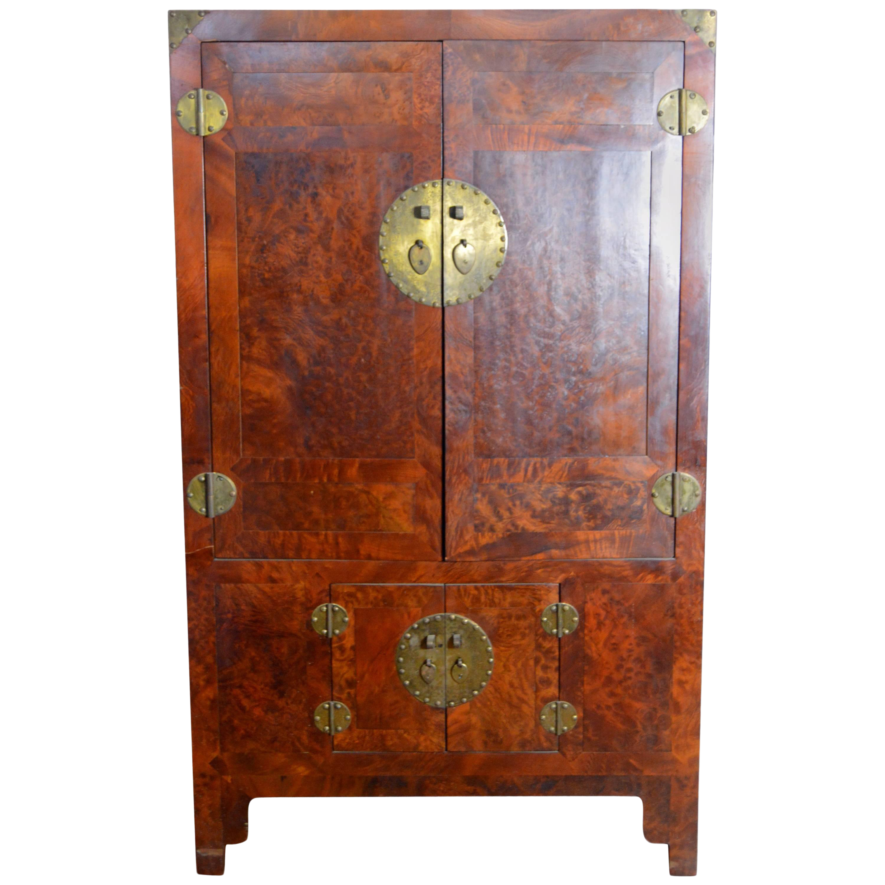 19th Century Chinese Stained Burlwood Four Door Armoire With Brass Hardware