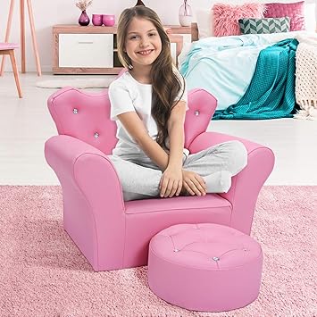 Casart Kids Sofa Set Pu Leather Children Armchair Chair W Free Footstool Seat Diamond Crown Pink