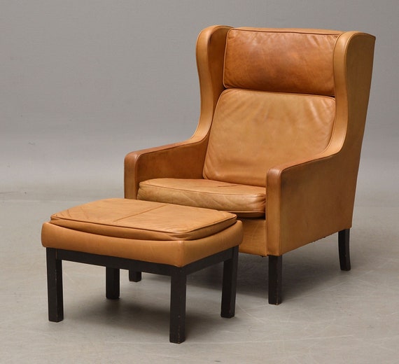 Cognac Colored Leather High Armchair Lounge Chair Cocktail Chair With Footstool Mid Century Denmark