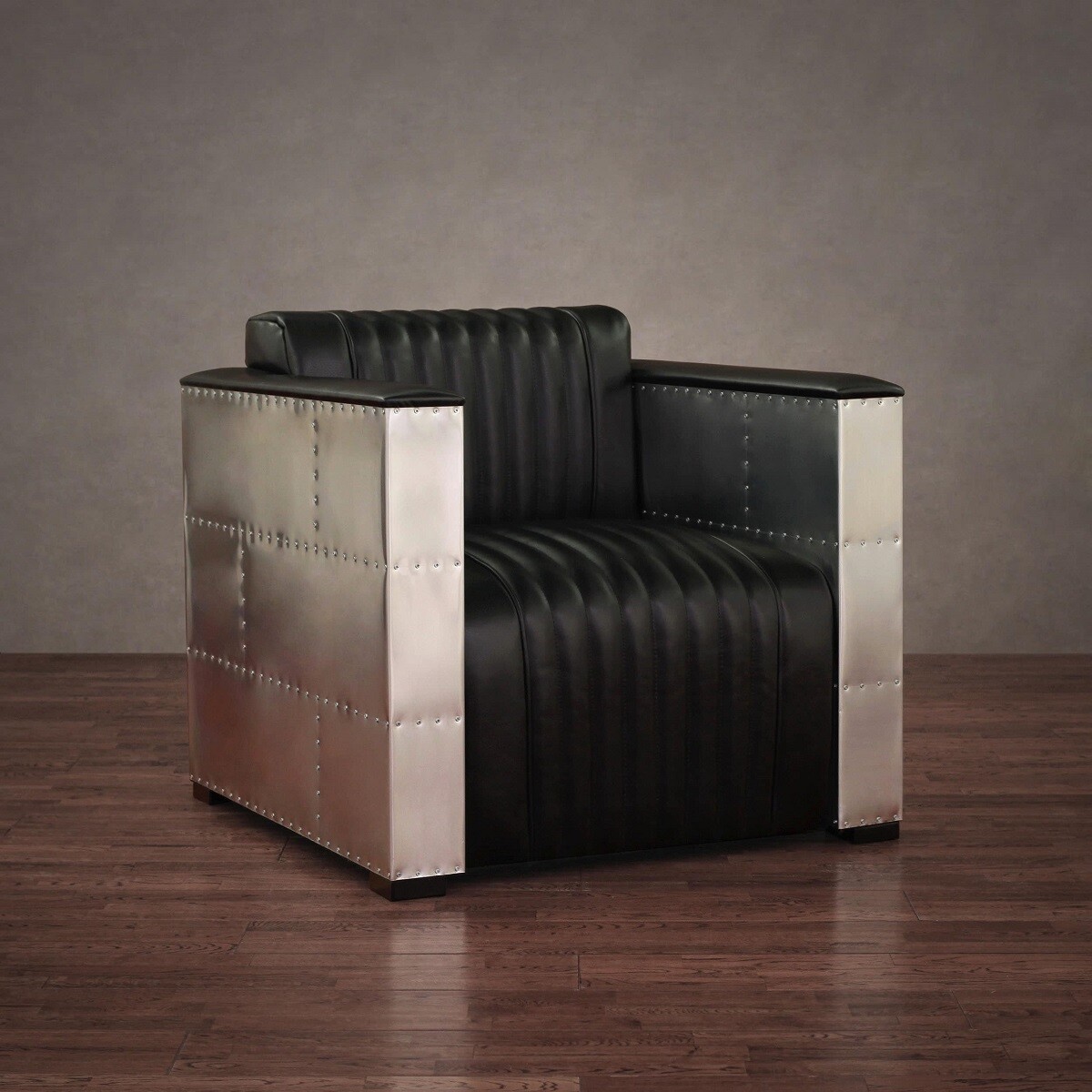 Aviator Black Accent Chair Leather Aluminum Sided Vintage Modern Pilot Armchair