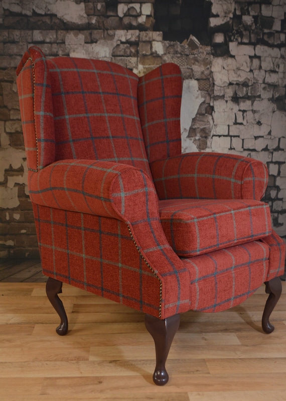 Queen Anne Wing Back Cottage Fireside Chair In Deep Claret Lana Tartan Check