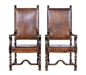Details About Pair Of 19th Century Carved Oak Leather Armchairs