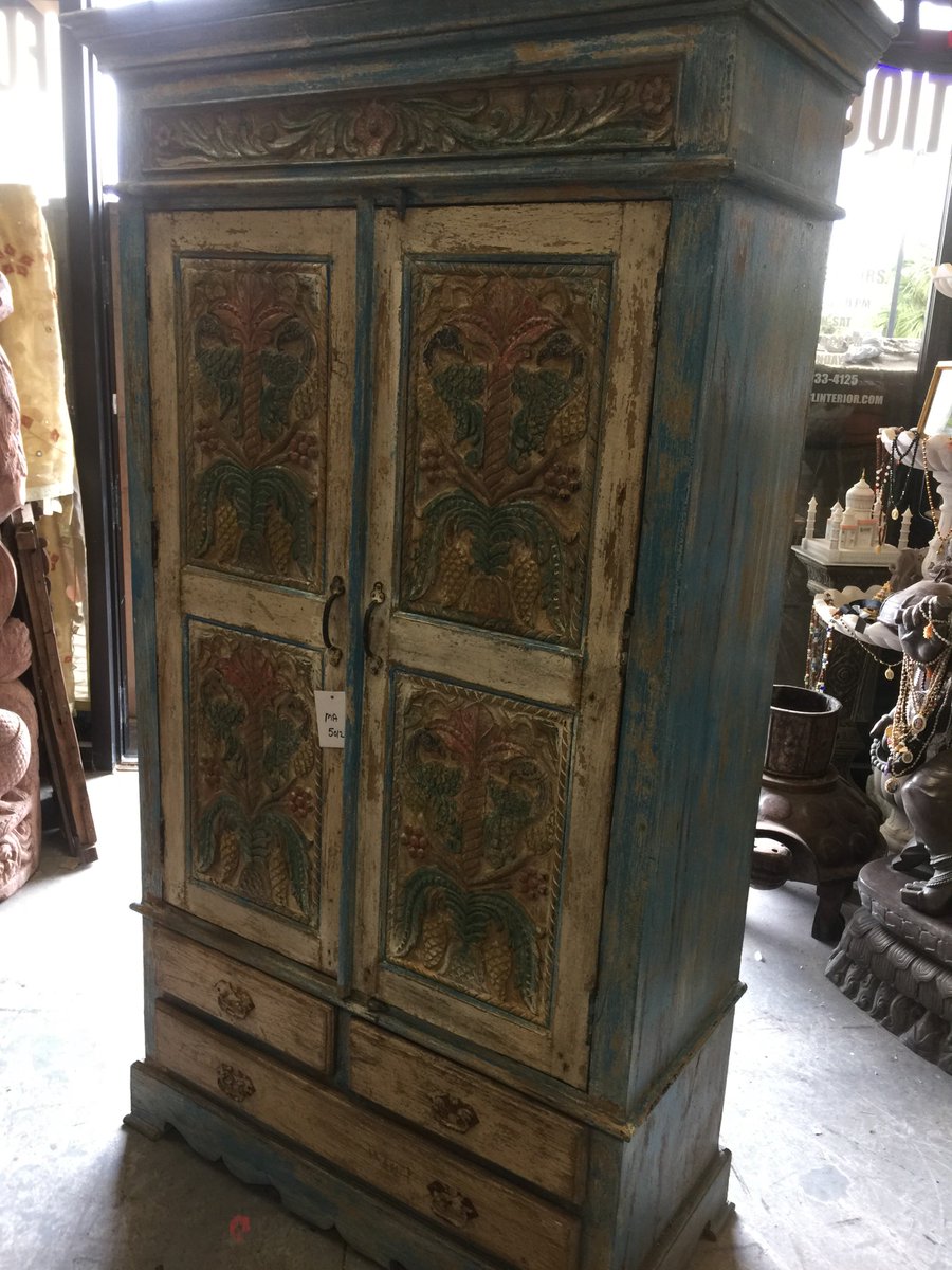 1920s Rustic Distressed Blue Indian Cabinet Teak Wood Indian Armoire