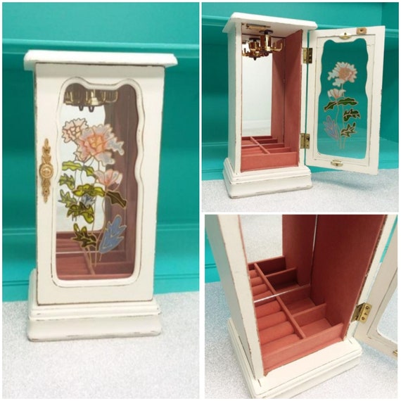 Shabby Chic Vintage Wooden Jewelry Box Floral Glass Mirrored Jewelry Armoire Cube Painted Off White Distressed Rustic Elegant Jewelry Box