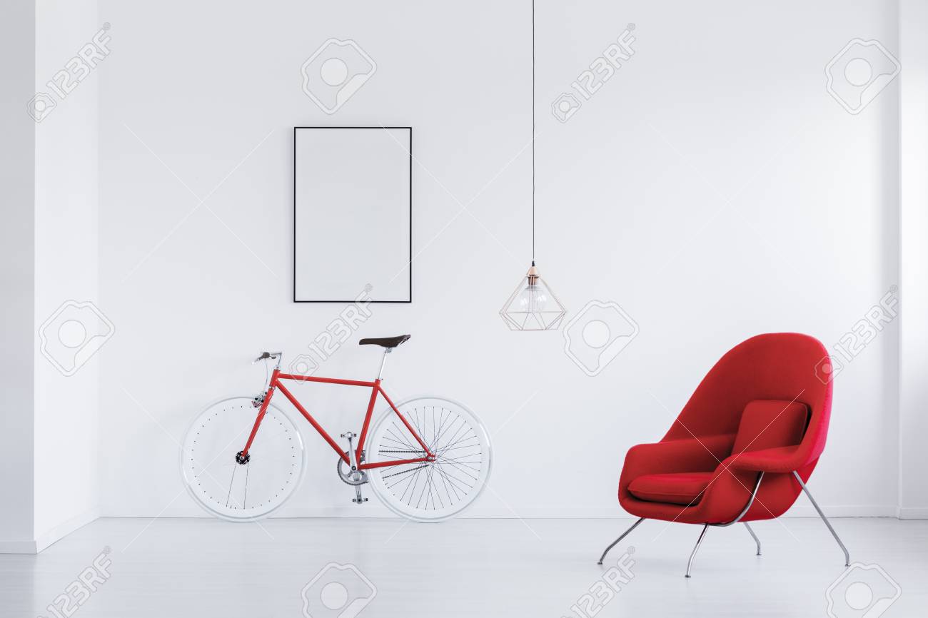 Red And White Hipster Bicycle Standing In White Room With Comfy