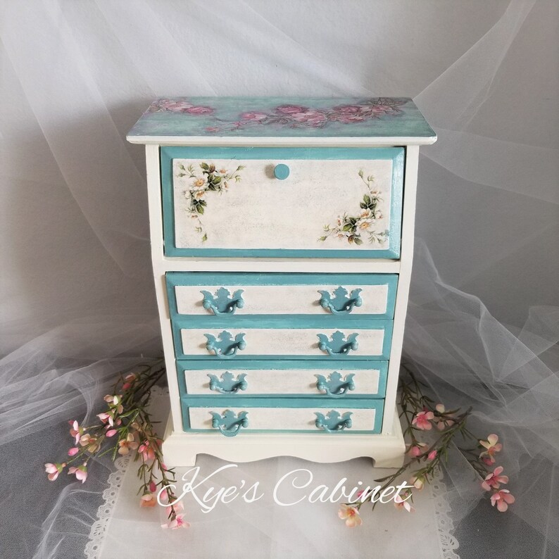 Personalized Jewelry Box With Decoupage Vine Roses Teal Blue Hand Painted Jewelry Box Upcycled Jewelry Armoire Special Gift For Her