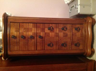 The porter valley jewelry armoire has curved drawers with ash burl faces the flip top has inset mirror and reveals top compartment with half ring pads half open area the 1st small drawer has 9 squares the 2nd small drawer has 4 squares and the 3rd small drawer has 4 rectangles from front to back.