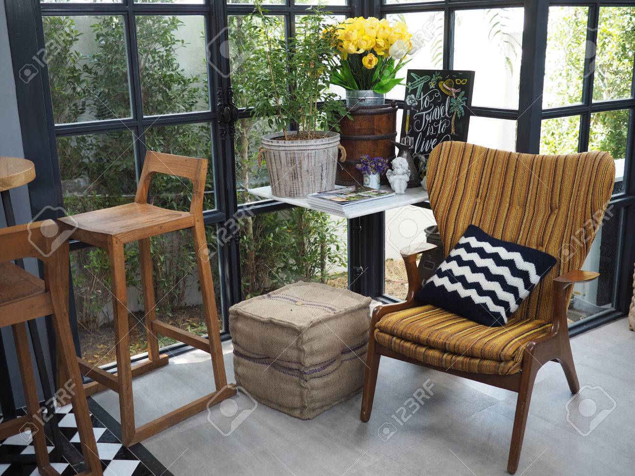 Blue Armchair And Square Table Placed Outside A Cafe Photo
