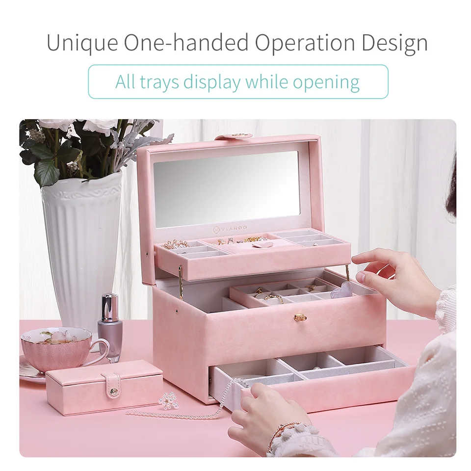 Vlando Princess Jewelry Box Organizer With Small Travel Jewelry Box 3 Layers One Hand Opening Gift Packing