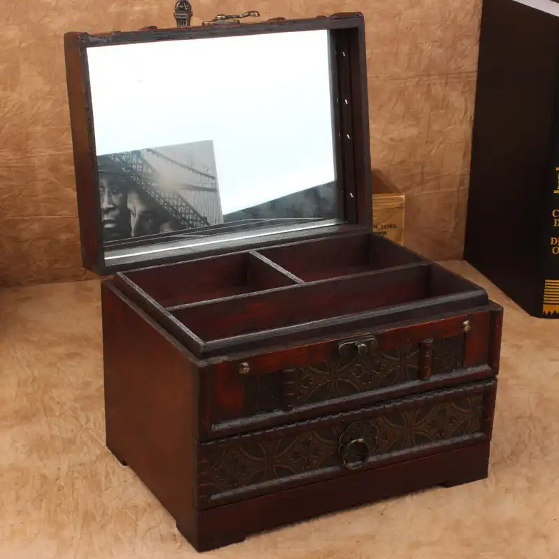 Retro Antique Wooden Vanity Box Retro With Mirror Jewelry