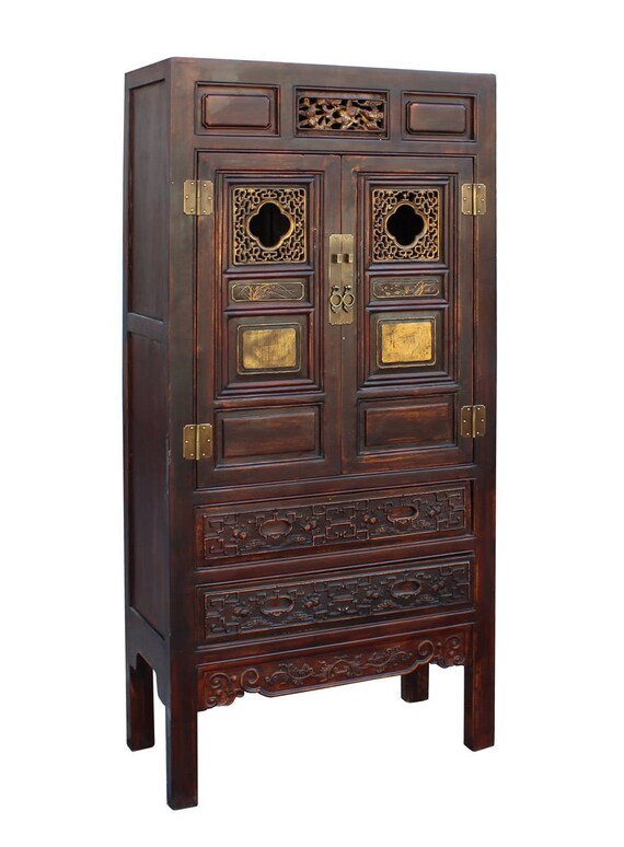 Chinese Fujian Brown Golden Carving Graphic Armoire Storage Cabinet Cs2981e