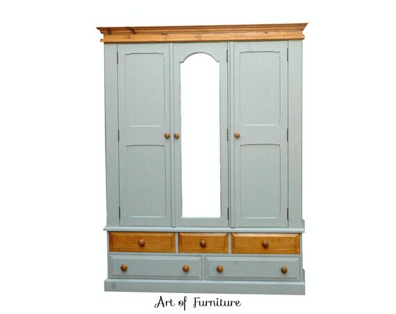 Sold Rustic Grey Solid Pine Provincial Country Triple 3 Door Mirrored Wardrobe Armoire Closet Cupboard With Drawers Hand Painted Upcycled